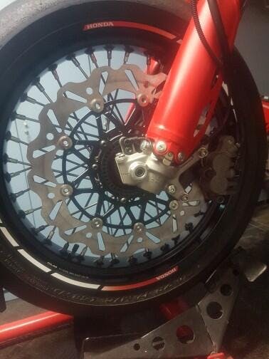 - Front oversize floating curve discs with cooling grooves. Floating design to prevent the rotor distortion.